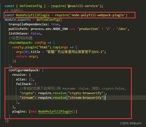 在顶行添加如下:const NodePolyfillPlugin = require('node-polyfill-webpack-plugin')