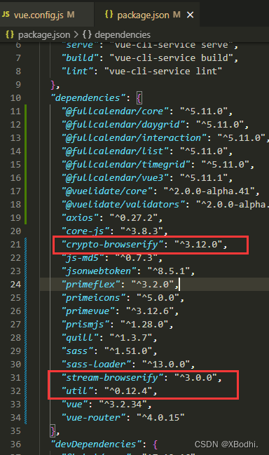 因为 @vue/cli 从 4.0 升级到 5.0 已经不默认包含 node.js 的核心 polyfills 组件了。项目的 package.json 的版本如下图:
