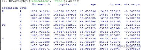 Group by 是 pandas 中可用的一个有趣的度量,它可以帮助我们找出不同分类属性对其他数据变量的影响。让我们看一个在同一数据集上的示例,我们想找出人们的年龄和教育对投票数据集的影响。