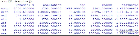 描述性统计是了解数据特征和快速总结数据的有用方法。python 中的 Pandas 提供了一个有趣的方法describe() 。describe 函数对数据集应用基本统计计算,如极值、数据点计数标准差等。任何缺失值或 NaN 值都会被自动跳过。describe() 函数很好地描绘了数据的分布情况。