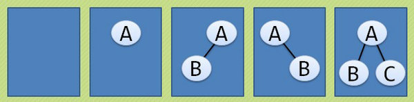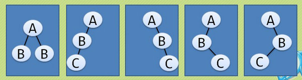 拥有三个结点的普通树只有两种情况:两层或者三层。但由于二叉树要区分左右,所以就会演变成如下的五种形态: