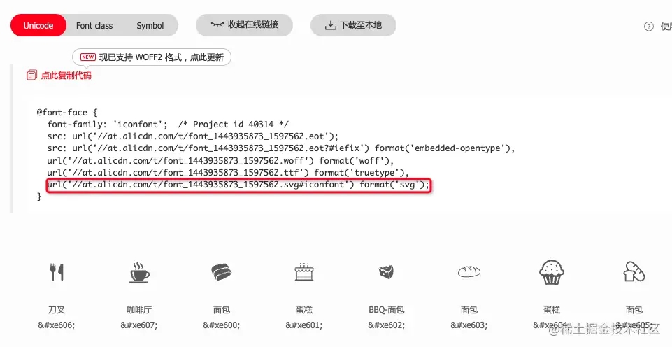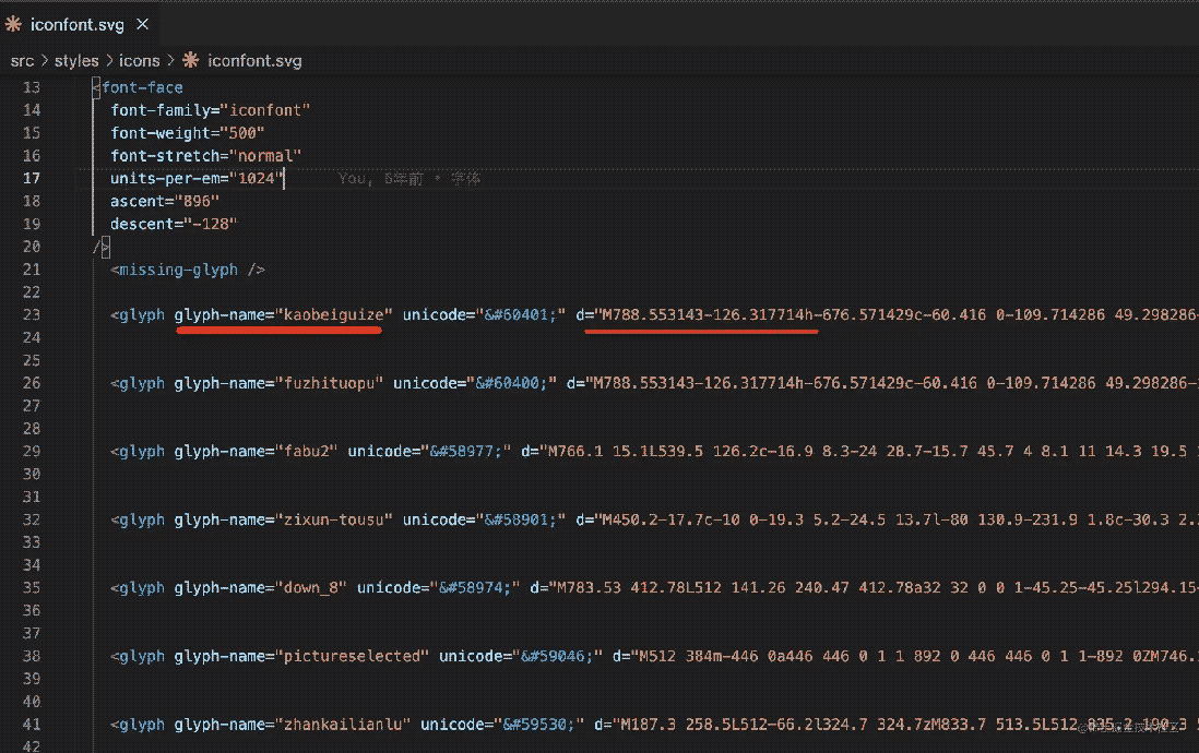 在 iconfont 字体样式中,css 包含了这样一个路径,或者我们可以在项目 css 中直接找到这段代码,然后下载这个 svg。 打开 svg 会看到如下代码