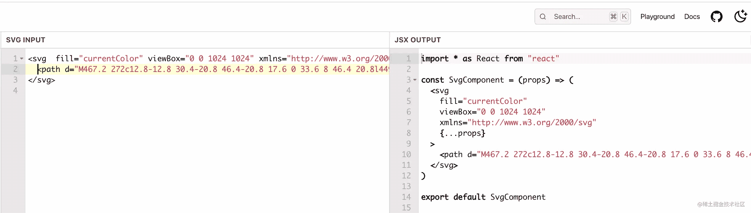 svgr 官网可以的 palayround 可以实时预览转换后的代码