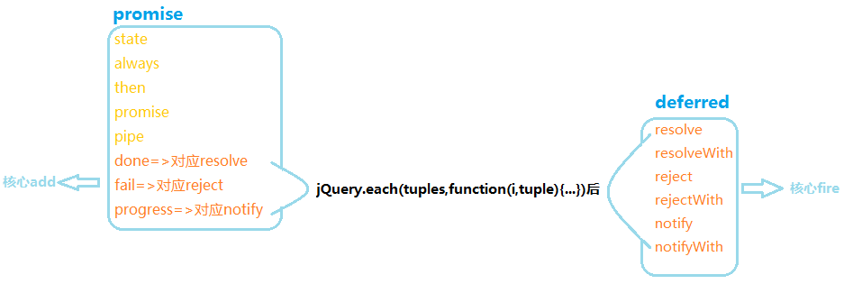 通过jQuery.each遍历tuples,将tuples里的三种状态操作值done、fail以及progress添加到promise对象,并分别指向各自自定义对象中的add方法。如果状态为resolved或rejected,那么,再将三个特定函数添加到各自自定义对象的list列表下。随后,就是对deferred对象赋予三个状态各自的触发事件啦。