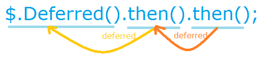 好了,那么如果then方法中的回调函数的返回值是一个非deferred对象呢?那么它就将这个返回值带上,直接触发then方法自行创建的deferred对象的相关事件,从而,如果then方法后有then方法,也就关联了。