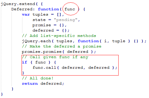 紧接着,func.call(deferred, deferred),即为执行参数func,当然,前提是func有值。值得注意的是,是将deferred作为func的执行对象以及执行参数的,这一点在promise.then中体现得淋淋尽致(稍后会细说)。