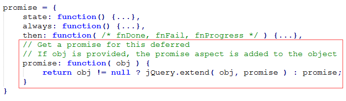所以接下来,源代码中的promise.promise(deferred),即为扩展deferred对象,让原来只有6个触发属性的deferred,同时拥有了promise对象的全部属性。