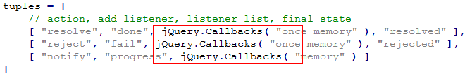 tuples = [ // action, add listener, listener list, final state [ "resolve", "done", jQuery.Callbacks( "once memory" ), "resolved" ], [ "reject", "fail", jQuery.Callbacks( "once memory" ), "rejected" ], [ "notify", "progress", jQuery.Callbacks( "memory" ) ] ]