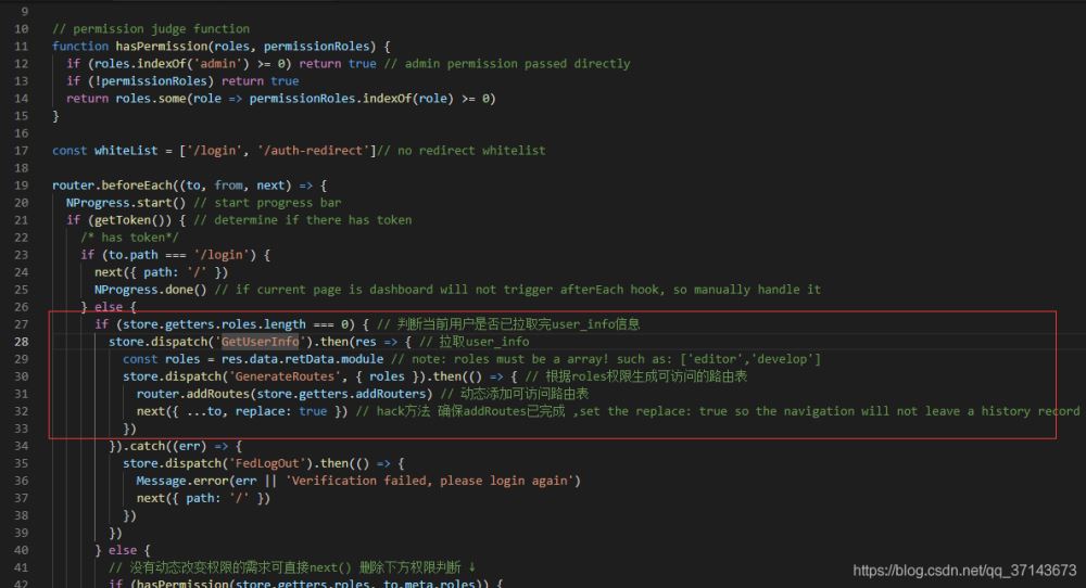 },不需要知道那个 new Promise 啥的干啥用,反正我不知道,只要知道 getUserInfo 这个方法就行了,这个方法会以上面之前保存的 token 为参数去请求获取你的用户权限,原逻辑是没有权限就跳登陆页面,我这系统需要,没权限也有个首页可看,所以
