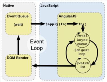 当浏览器接收到angular context相关的事件时,$digest循环就会被触发。它由2个小循环组成,1个处理evalAsync 队列,另一个处理$watch队列。$digest进行循环时,将遍历$watch队列,查看是否有数据更新过,这种遍历就叫做dirty-checkin(脏检查),如果脏检查发现有$watch更新,将会触发新的脏检查,直到所有的$watch都没有更新。这样就能保证每个model都不会变化。