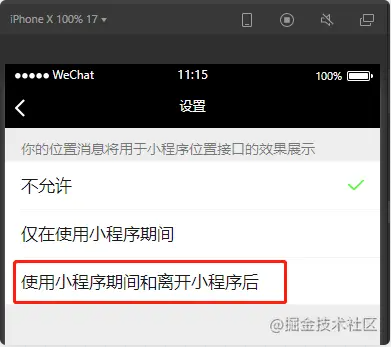 如果调用失败,而且setting API返回的授权列表location的未授权则表示用户未授权。引导用户自己在设置中打开授权;