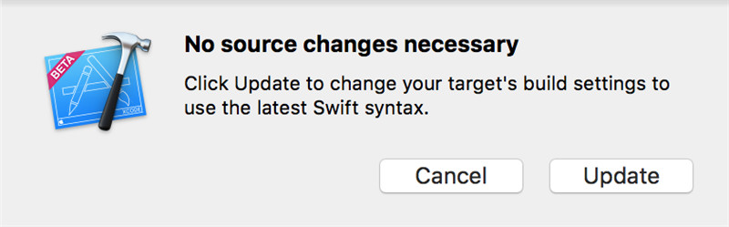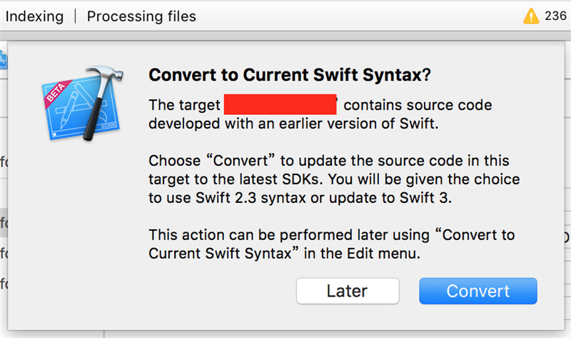 2. swift版本假如你Xcode7的工程中使用了swift,那么你使用Xcode8一打开工程就会出现下面的选项,选择convert: