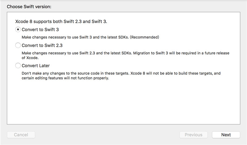 选convert后,会让你选择swift的版本。 如果你选择了3.0版本的swift选项,那等待convert结束后,一般依然有一部分需要你做手动适配。 假如你暂时不想花费时间做swift版本的适配,你可以选择swift2.3版本,convert并不会转换任何内容,你的项目也可以像以往在Xcode7中那样正常运行。此时我们选择swift2.3:
