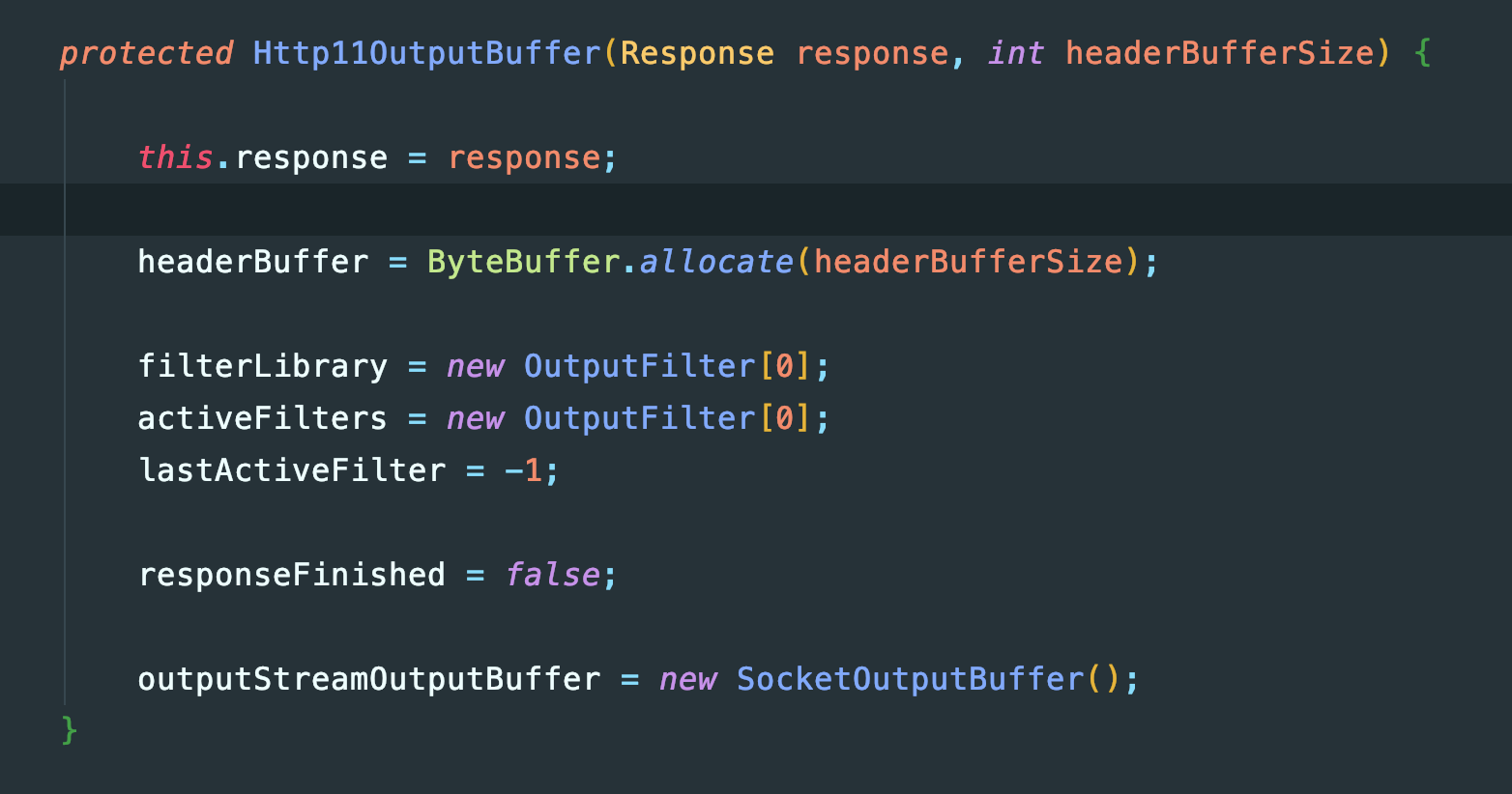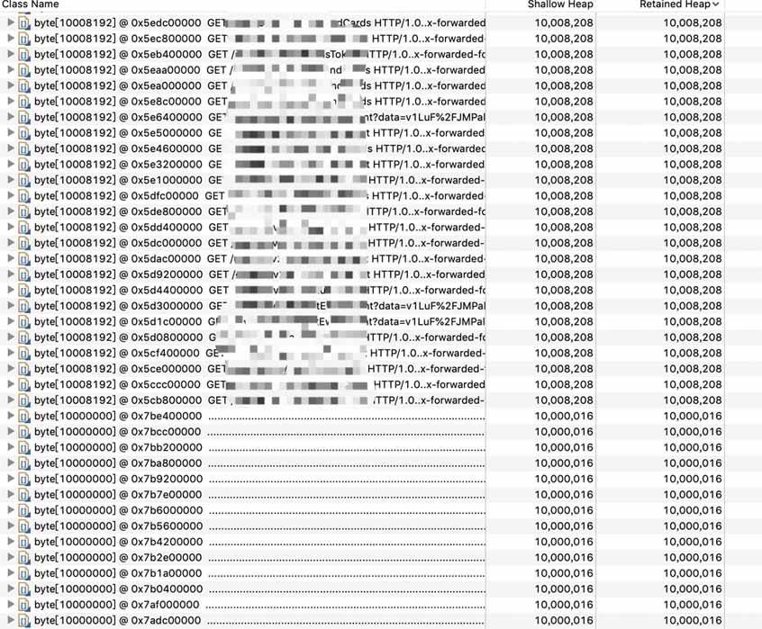 这也就是为什么之前看到大量的buffer是10008192字节的。至于为什么分配的buffer需要是MaxHttpHeaderSize ReadBuffer。显然还有一批内容是空的10000000字节的buffer应该是output buffer,源码可以印证这点: