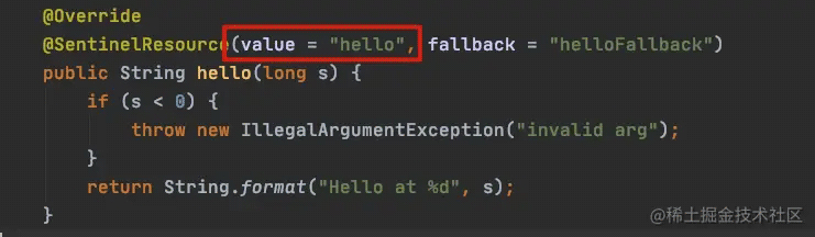 @SentinelResource(value = "hello", fallback = "helloFallback")