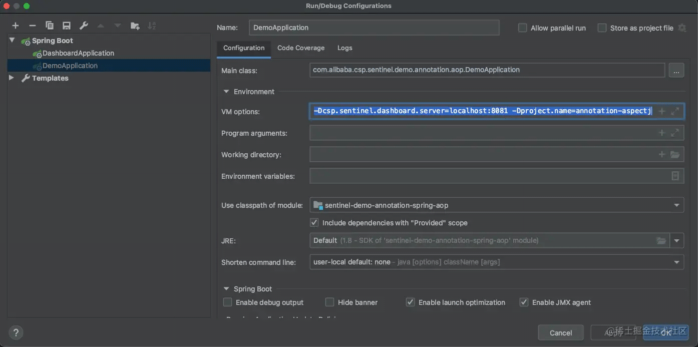 -Dcsp.sentinel.dashboard.server=localhost:8081 -Dproject.name=annotation-aspectj
