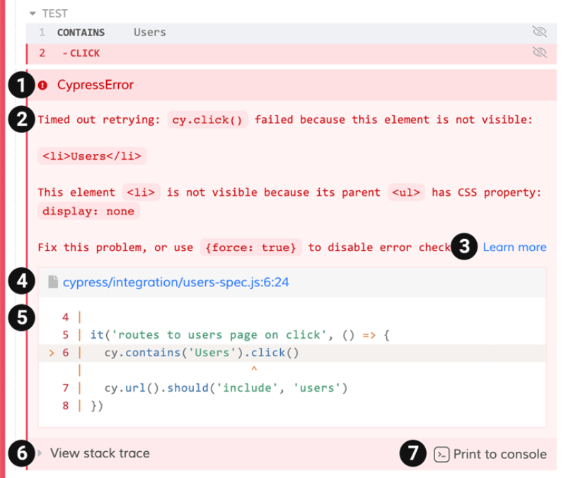 在cypress中,如果发生了错误,会打印如下的信息(对应图里标记的序号阅读):