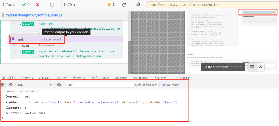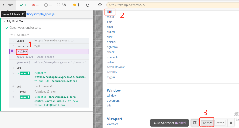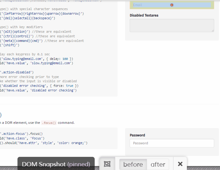 比如现在点击type命令,单击before将以输入框之前的样子,应该显示占位符文本信息。单击after将显示TYPE命令完成后输入的样子,显示fake@email.com。