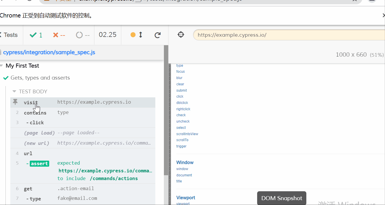 姑且叫它时间穿梭吧。期初我还有点莫名其妙,后来用了才知道,确实好用。就是当你的鼠标在左侧的命令日志上悬停时,cypress会自动回到那个命令解析时的快照,于是乎,在右侧的预览窗口,就可以看到对应这个命令进行的动作。