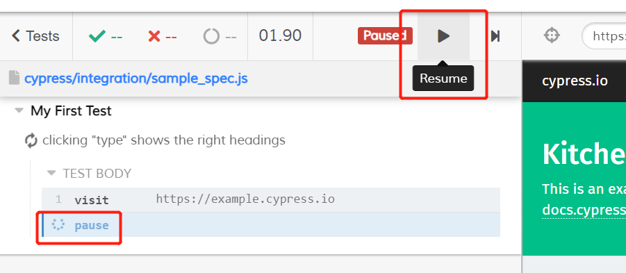 })可以看到程序运行到cy.pause()就会暂停,可以手动点击继续,进行下一步操作。