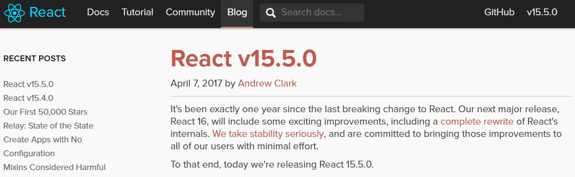 反观React的升级倒是非常谨慎的,这从最新的v15.5.0的发布新闻博客中就能看出