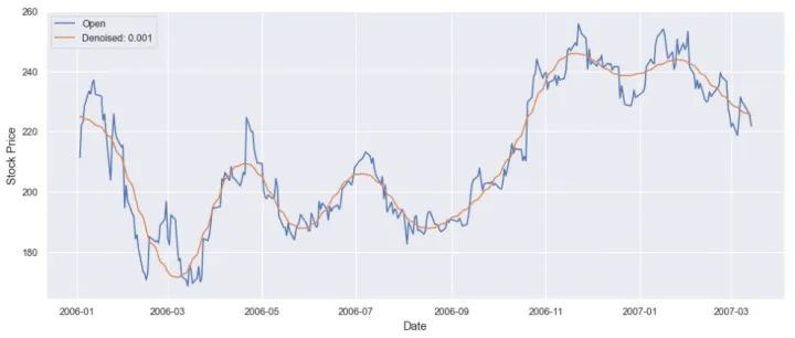 傅里叶变换可以通过将时间序列数据转换到频域来帮助去除噪声,我们可以过滤掉噪声频率。然后应用傅里叶反变换得到滤波后的时间序列。我们用傅里叶变换来计算谷歌股票价格。