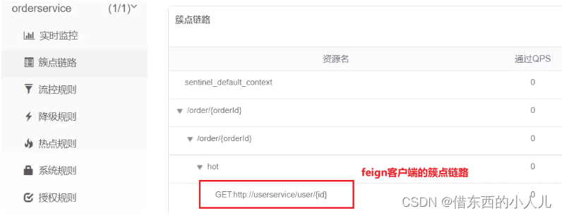 }重启后,访问一次订单查询业务,然后查看sentinel控制台,可以看到新的簇点链路:
