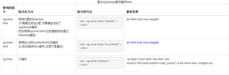 表格第一行: myHtml是一段字符串,但是它的内容是一段html,使用ng-bind-html可以把它作为元素的.html()绑定给元素.在这里我们给模块添加依赖 'ngSanitize' ,(需要链入angular-sanitize.min.js).然后使用ng-bind-html,$sanitize会自动对myHtml进行净化.