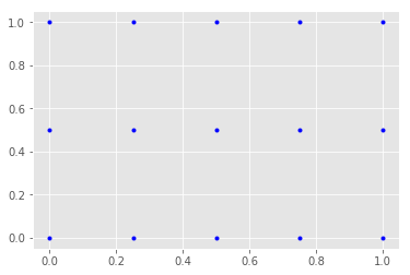 import numpy as np import matplotlib.pyplot as plt %matplotlib inline m, n = (5, 3) x = np.linspace(0, 1, m) y = np.linspace(0, 1, n) X, Y = np.meshgrid(x,y)
