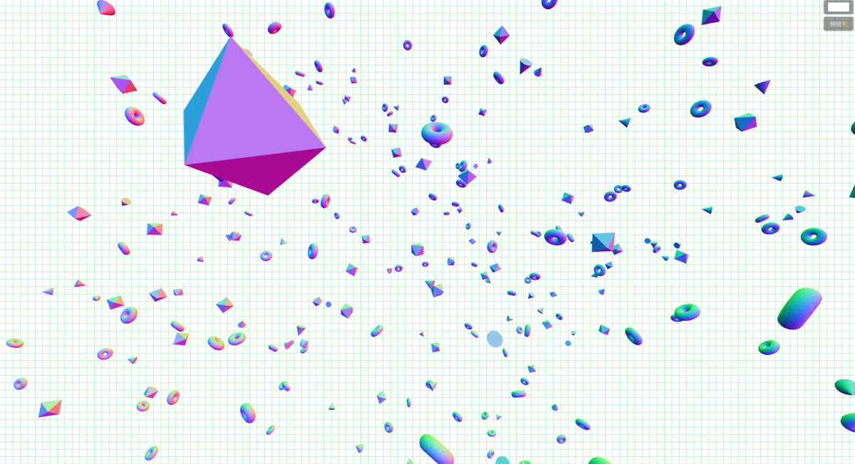 在 Three.js Journey 课程示例中,提供了一个使用 Three.js 内置方法实现的 3D 文字悬浮效果的例子,本文使用 React   Three.js 技术栈,参照示例实现类似的效果。本文中涉及到的知识点主要包括:CSS 网格背景、MeshNormalMaterial 法向材质、FontLoader 字体加载器、TextGeometry 文本缓冲几何体、TorusBufferGeometry 圆环缓冲几何体、ConeBufferGeometry 圆锥缓冲几何体、OctahedronBufferGeometry 八面缓冲几何体、Three.js 后期渲染、GlitchPass 通道、Element.requestFullscreen、Document.exitFullscreen 等。