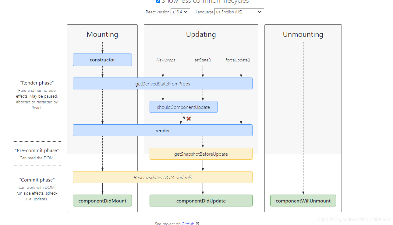 getSnapshotBeforeUpdate:在最后一次渲染输出(提交到DOM节点)之前调用,可以在元素提交到DOM之前收集当前的DOM信息(例如当前DOM的滚动位置),之后返回待传给componentDidUpdate周期方法(该方法是元素提交到DOM之后调用的,所以此时获取的DOM信息是更新后的);