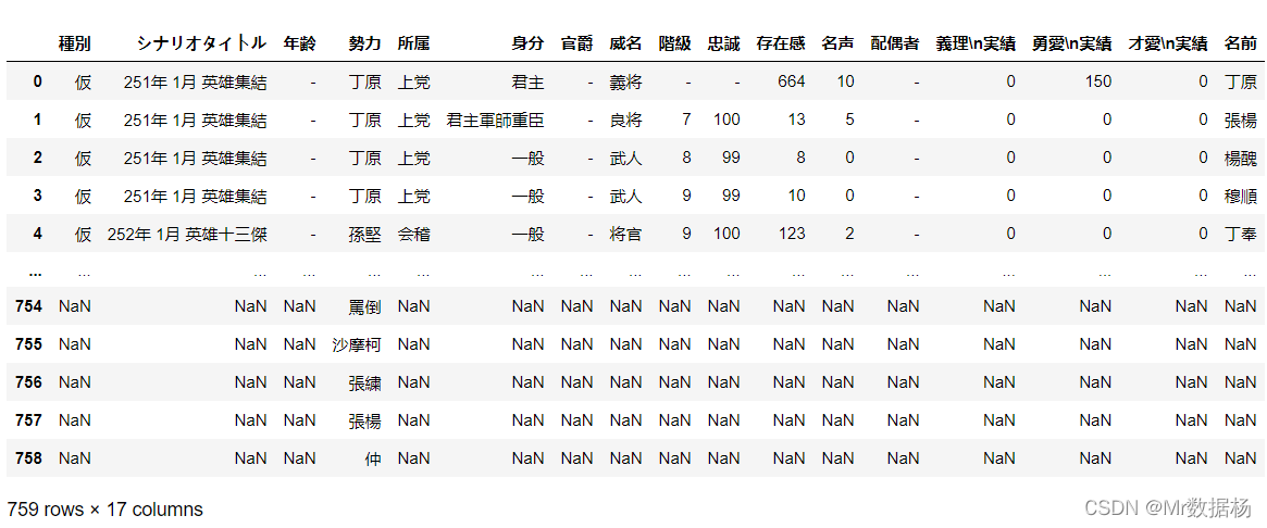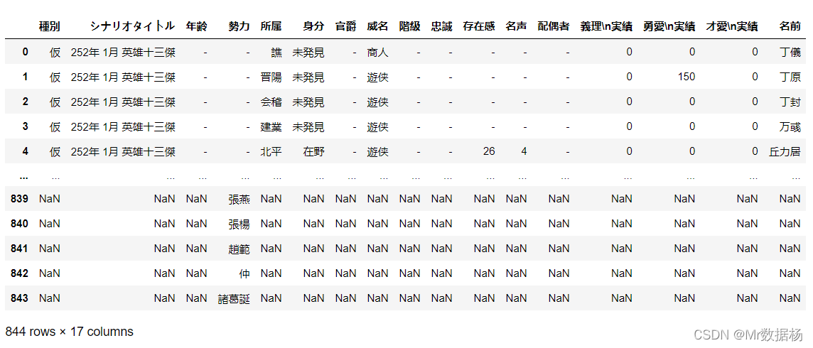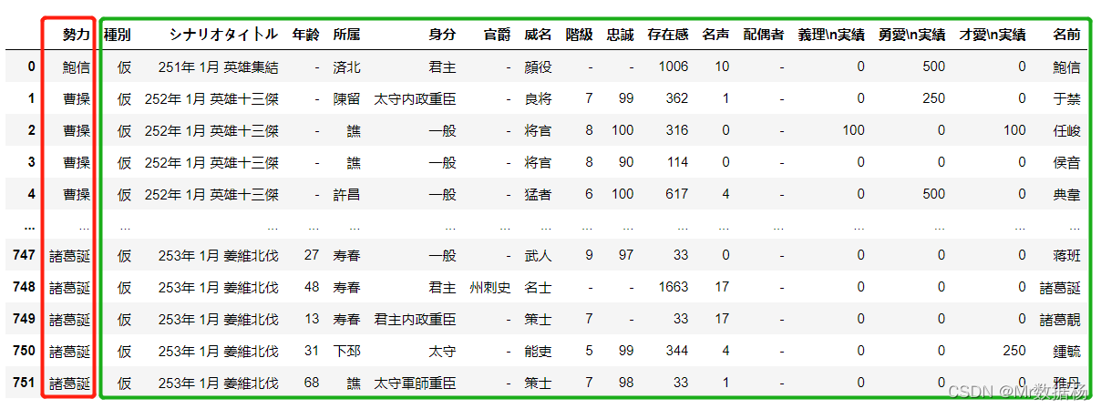 我们要进行势力所属和人物直接关系的拼接操作,读取的数据包括下面的2个列表,并将 人物历史登入数据 中没有势力的数据剔除。