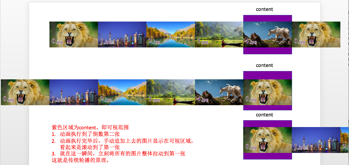 如果没有的话,并且图片现在是显示到了最后一个,则先执行动画,执行完毕后,立刻将content中所有的图片内容拉回到第一个,但是这里任然会穿帮,因为当前图片显示为最后一个后,你继续执行动画,是没有任何效果的,所以在这个动画执行期间是没有任何反应的,当动画时间执行完毕后,会突然在界面上出现第一个图片。