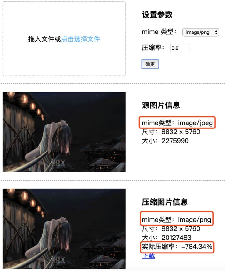 有个折衷的方案,我们可以设置一个阈值,如果 png 图片的质量小于这个值,就还是压缩输出 png 格式,这样最差的输出结果不至于质量太大,在此基础上,如果压缩后图片大小 “不减反增”,我们就兜底处理输出源图片给用户。当图片质量大于某个值时,我们压缩成 jpeg 格式。