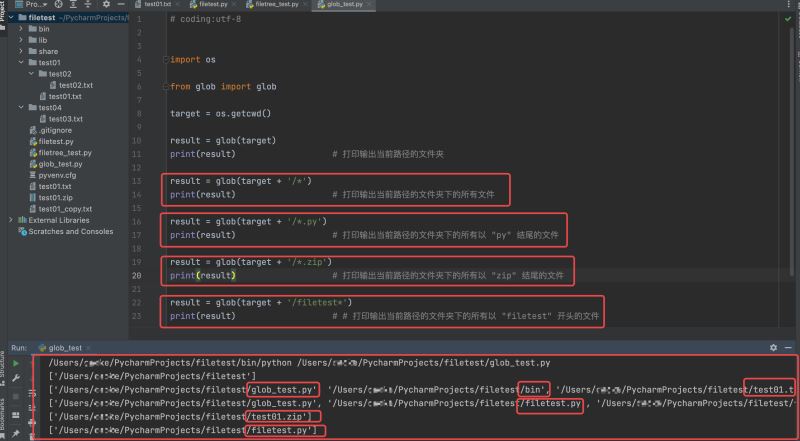 # coding:utf-8 import os from glob import glob target = os.getcwd() result = glob(target) print(result) # 打印输出当前路径的文件夹 result = glob(target '/*') print(result) # 打印输出当前路径的文件夹下的所有文件 result = glob(target '/*.py') print(result) # 打印输出当前路径的文件夹下的所有以 "py" 结尾的文件 result = glob(target '/*.zip') print(result) # 打印输出当前路径的文件夹下的所有以 "zip" 结尾的文件 result = glob(target '/filetest*') print(result) # # 打印输出当前路径的文件夹下的所有以 "filetest" 开头的文件