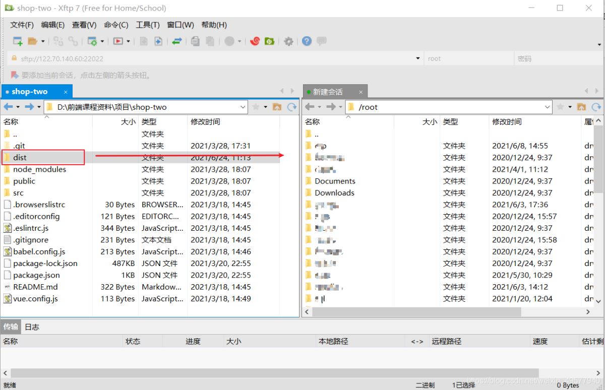 左侧进到刚刚打包好的文件存放路径 , 把dist文件夹复制到右侧服务器中部署的文件夹里, 看你们是部署到哪个文件夹就拖到哪里