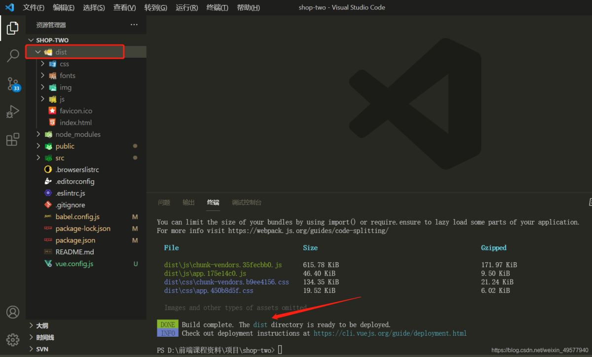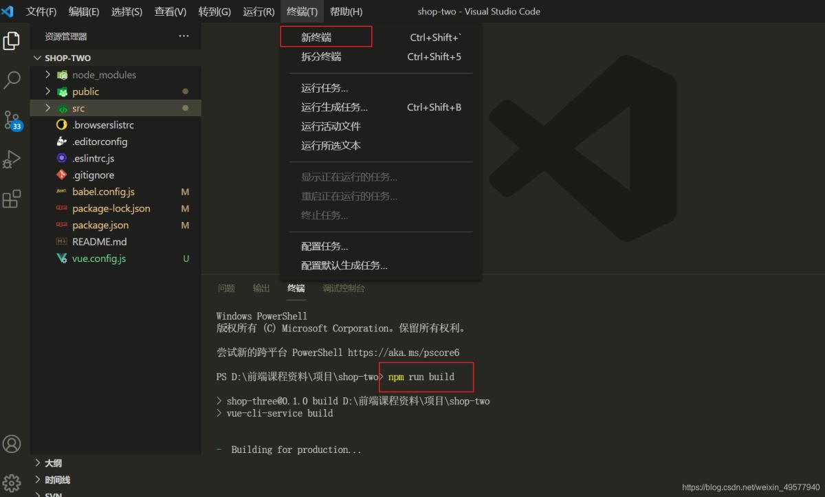 1 , vscode打开你的vue项目 -- > 点终端- > 新终端- >输入npm run build 按回车 , 显示正在打包..稍等一会