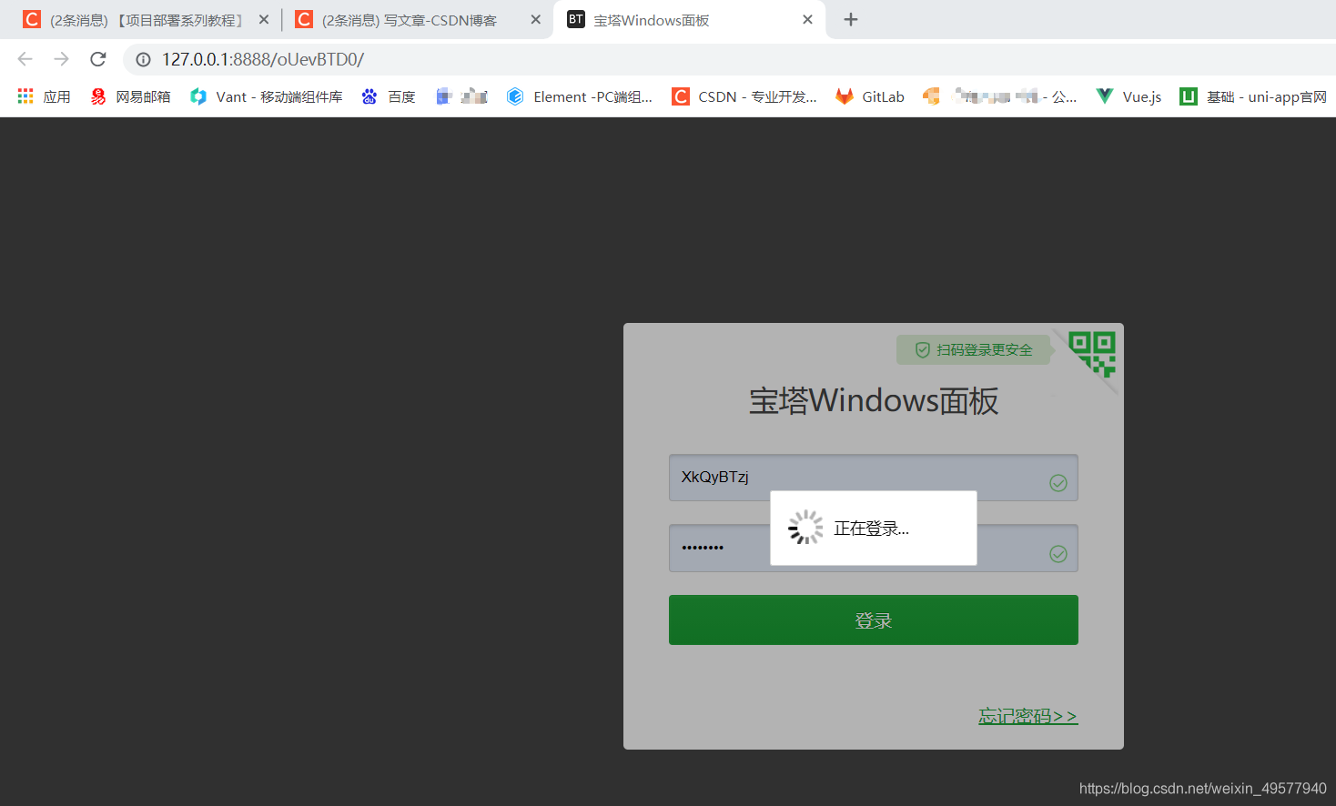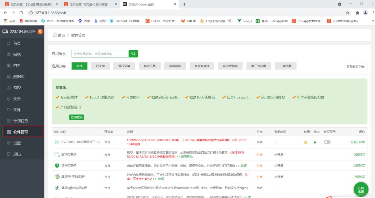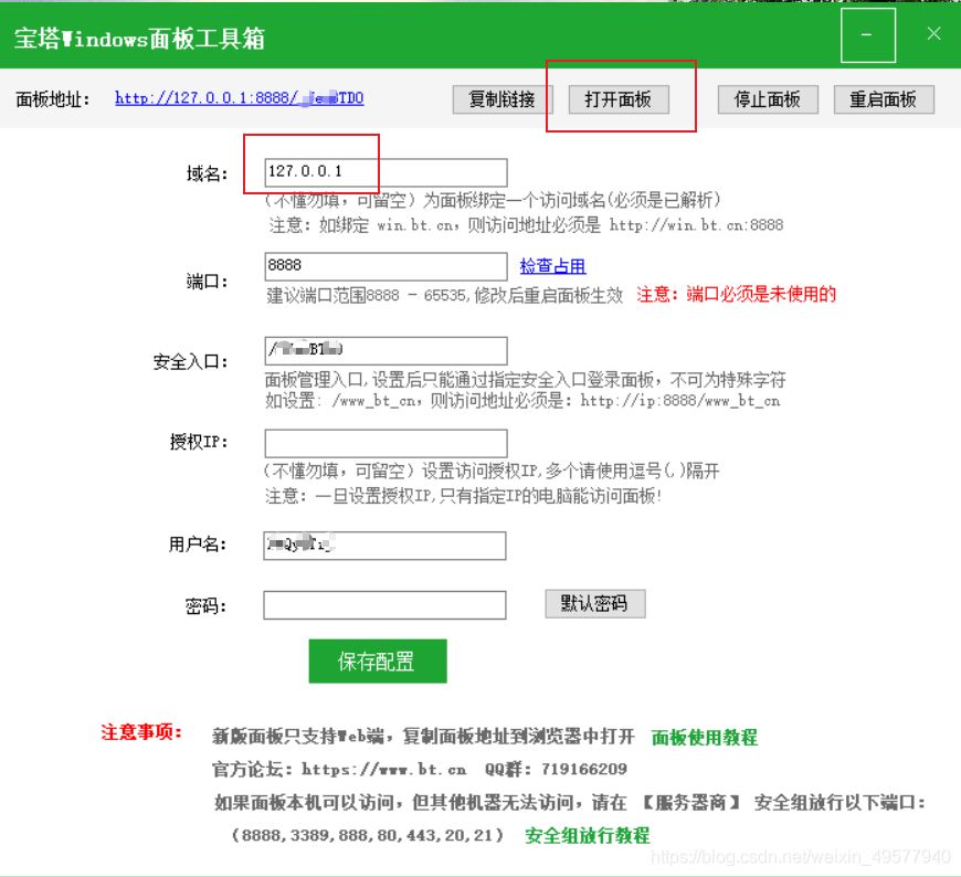 1 , 打开宝塔面板, 配置 , 因为宝塔要在本地浏览器中打开, 所以域名就写本地 127.0.0.1 , 保存配置后点打开面板 ,会在浏览器中打开, 点登录 (宝塔安装和配置有不懂的可以搜一下别的博客,有详细介绍)