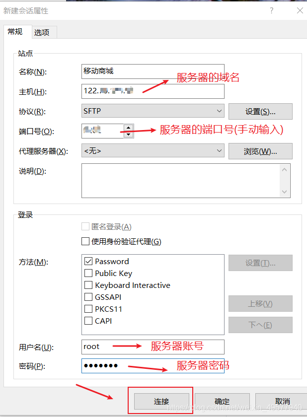 2 .点完之后弹出这个框, 填写完信息之后点连接 , 服务器的相关信息问公司的人要