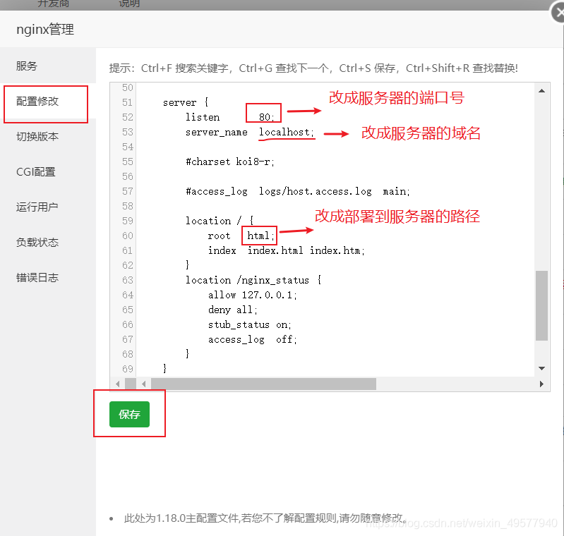 5 , 弹出一个框 , 点左边的配置修改 ,滚动条拉到下面,按下图标的修改后点保存