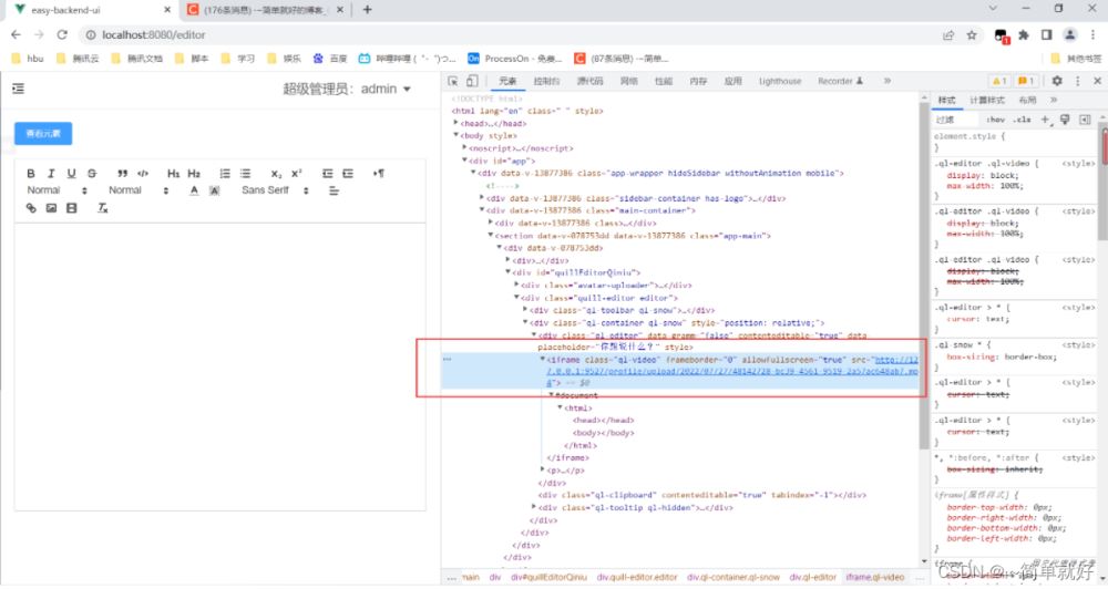 当我们手动的把页面iframe标签改为video标签时视频就显示出来了,找到问题,开搞