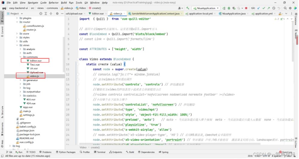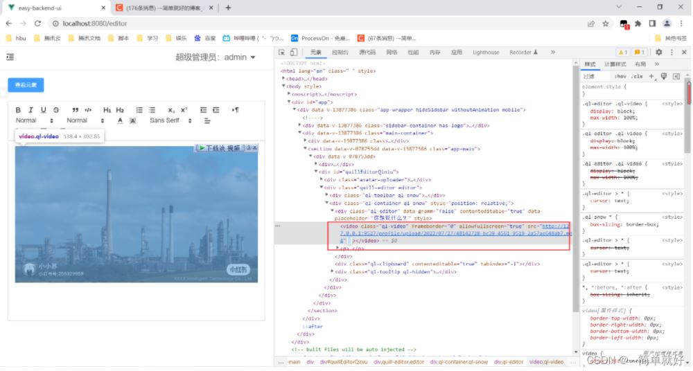 因为quill-editor富文本编辑器当我们上传mp4等视频类型的文件时,quill-editor会自动的用iframe标签来创建,此时视频文件将不能显示出来,我们需要改写quill-editor提供能video.js文件,更改为video的标签来展示视频