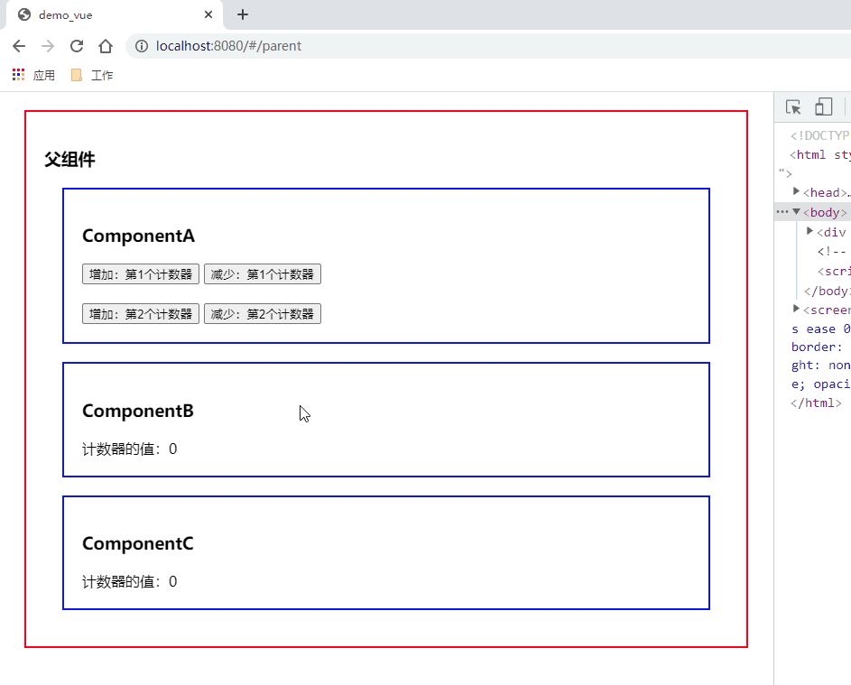 本处用计数器来测试:一个组件修改计数器的值,其余两个不相关组件可以监测到时计数器值的改变。