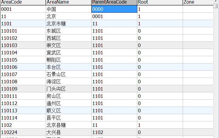 规律:根据国家级(中国)的areacode查询省级(如:北京) ; 根据省级的areacode查询市级(如:北京市辖);根据市级的areacode查询区级(如东城区)