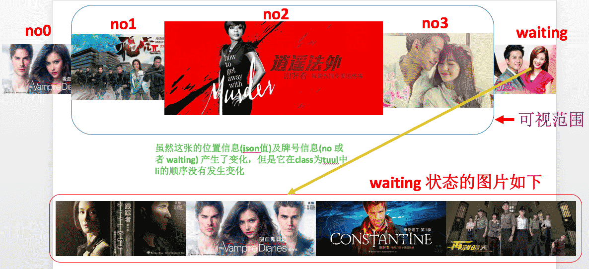 1. class为tuul的ul,也就是存放需要轮播的图片;里面的li主要有两种class:包装为 "no" 与 "waiting" 形式,其中 "no" 系列表示当前可能处于"活跃"状态的图片,而 "waiting" 表示这些图片当前处于隐藏状态,在接下来的CSS代码中就有体现。