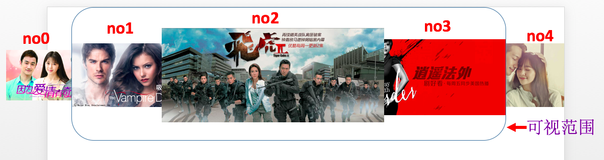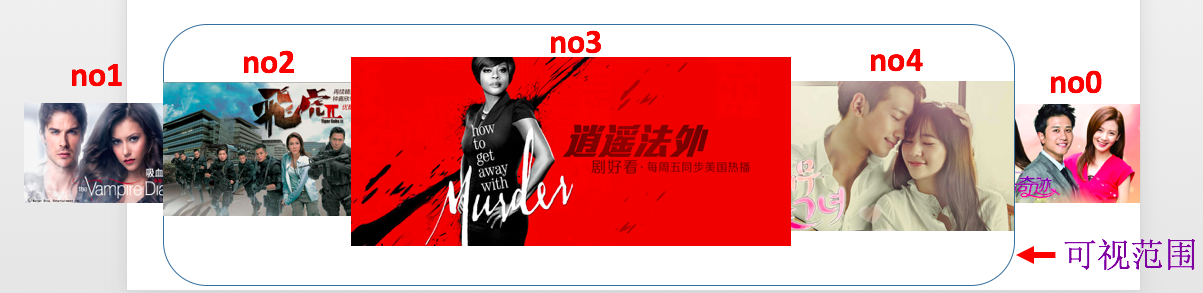 1. 对 "活跃" 图片的CSS的设置,即 #youku li.no0~no4的设置,注意到no0的left值是负数,而no1的left值是0,这就印证了上面我所表达的观点,可视范围静止状态是显示三张图片的,而其余两张图片是分别在可视范围的左右侧。注意设置各个图片的z-index值,使得有立体层次感,值越大越靠前显示。