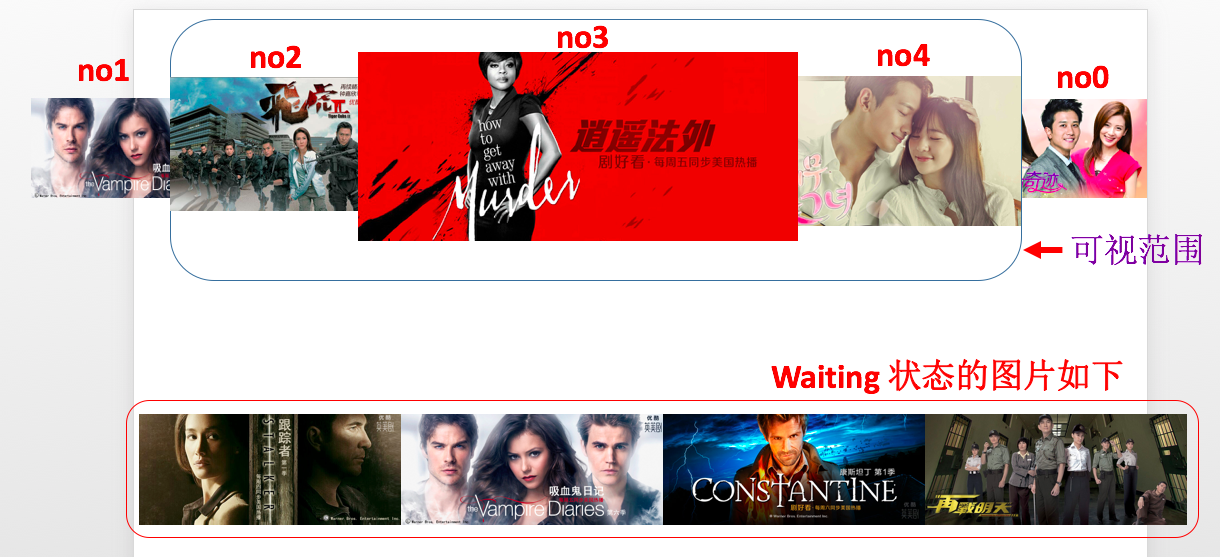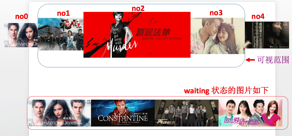 上面的代码执行后,意味着将 上图中 "no0" 这张图片拉入到 "waiting" 区域,而其他四个的编号则依次往前推算。执行完毕后,剖析图如下: