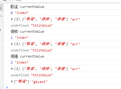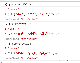 currentvalue 当前元素的值 index 索引值 arr 当前元素属于的数组对象 thisValue 对象作为该执行函数的回调