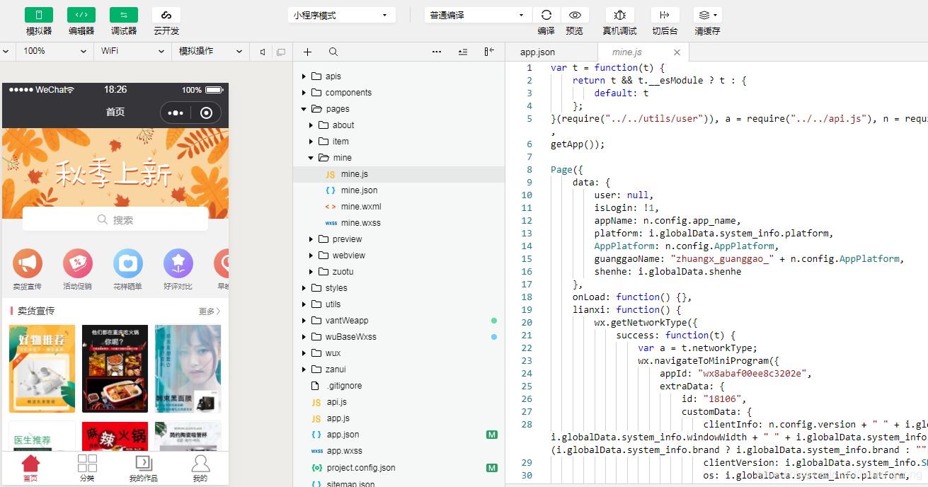 用node wuWxapkg.js filepath执行成功后,查看反编译成功后的文件夹,源码中除了project.config.json这个配置文件,其他的都有。导入项目后就可以看到效果了,期间可能会出现一些问题,需要调试一下。下图是编译成功后的截图。