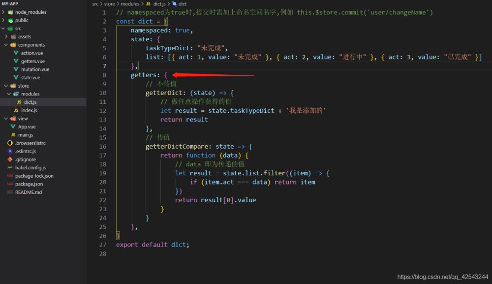 我们在index.js中设置了两个getters事件,在子模块dict.js中设置了两个getters事件